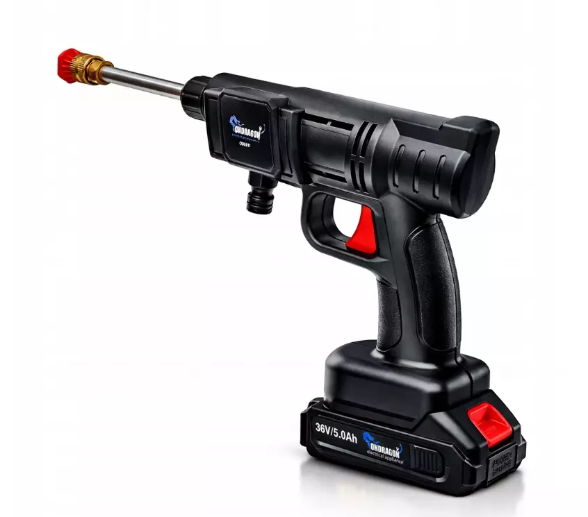 - Портативна акумуляторна мийка високого тиску з безщітковим двигуном, що забезпечує максимальний тиск води 30 барів.