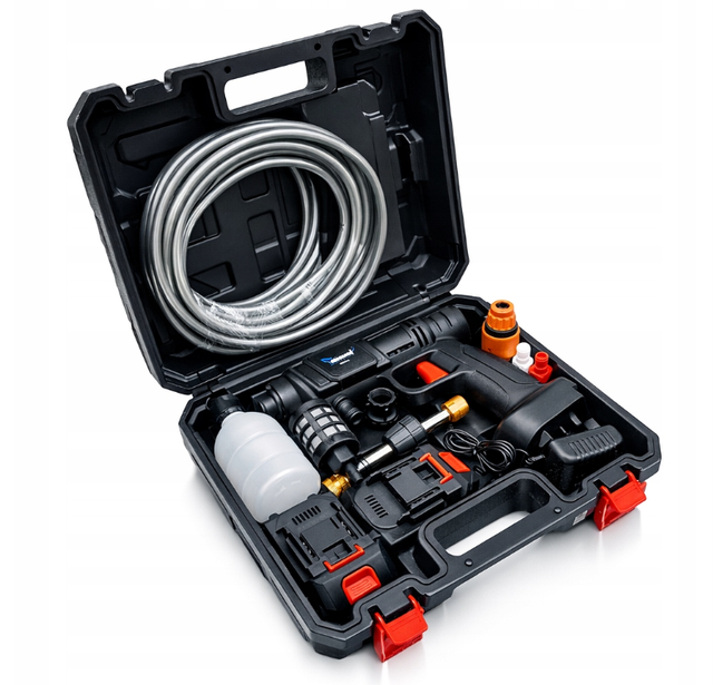 - У наборі вже є все необхідне для початку роботи: шланг із фільтром, насадки різного кута, ємність для мийного засобу та зручна валіза для транспортування