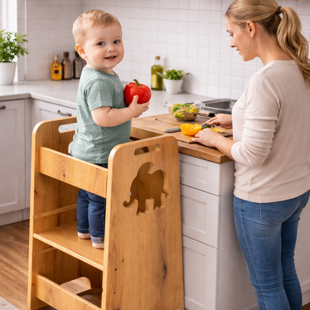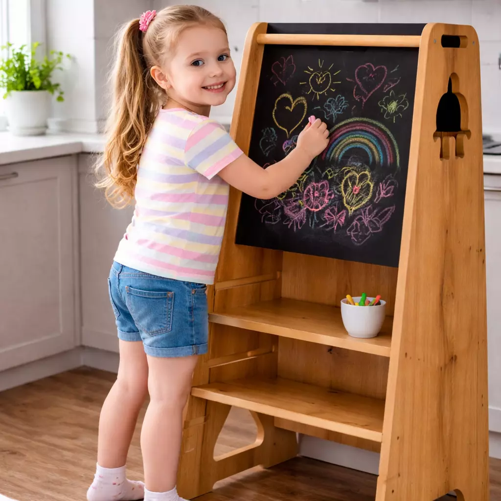 Кухонний помічник має стабільну конструкцію та захисні бортики, які запобігають падінню дитини. Міцна конструкція забезпечує довготривале використання, а регульовані сходинки дозволяють легко підлаштувати висоту під зріст дитини. Це чудовий вибір для батьків, які хочуть безпечно залучати дитину до домашніх справ.