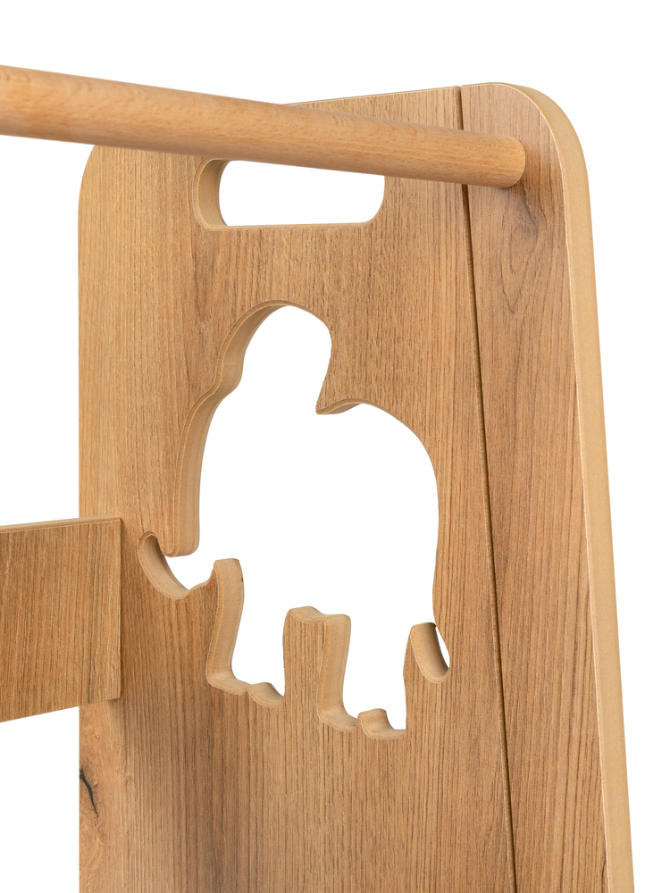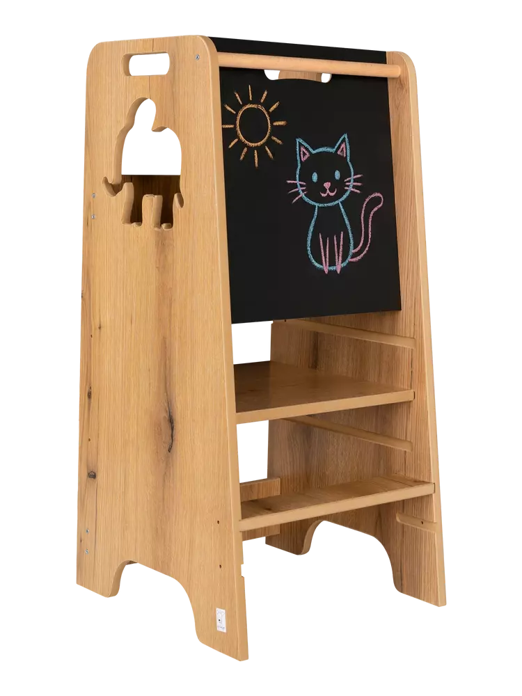 Ця модель кухонного помічника розроблена та виготовлена в Польщі з увагою до кожної деталі. Дошка для малювання та декоративний мотив слона роблять його не лише практичним, а й стильним елементом дитячого інтер’єру.