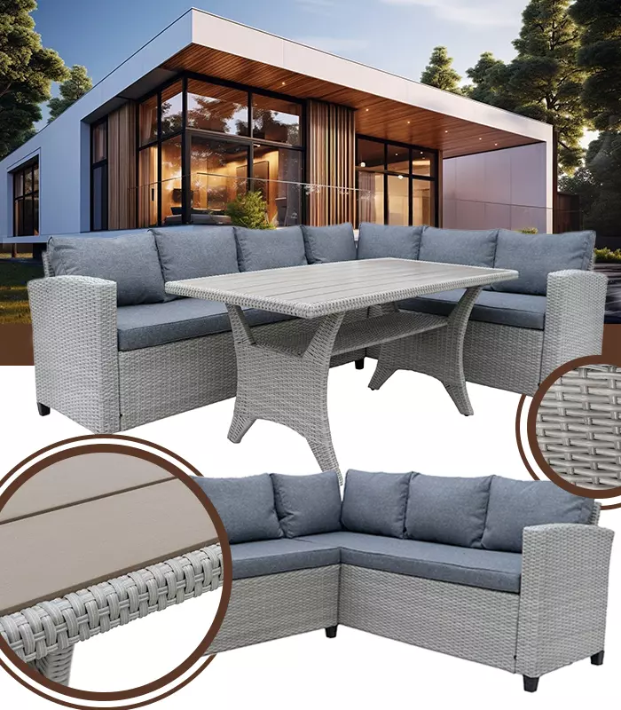 Цей елегантний набір садових меблів із техноротангу розрахований на шість осіб, що робить його ідеальним вибором для сімейних обідів, літнього барбекю чи зустрічей із друзями. Завдяки своїй функціональності та сучасному дизайну він чудово впишеться як у приватний сад, так і на терасу. Великий, стійкий стіл забезпечує достатньо місця, щоб кожен гість міг зручно приймати їжу. Це ідеальне поєднання обідньої зони та простору для відпочинку — тут можна як насолодитися вечерею, так і розслабитися з ранковою кавою. Виготовлення з високоякісного техноротангу робить набір стійким до змін погоди, ультрафіолетового випромінювання та вологи. Він не потребує складного догляду — достатньо протерти його вологою ганчіркою, щоб він знову засяяв. Стабільна металева конструкція гарантує довговічність на довгі роки.