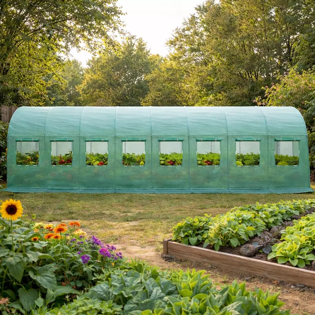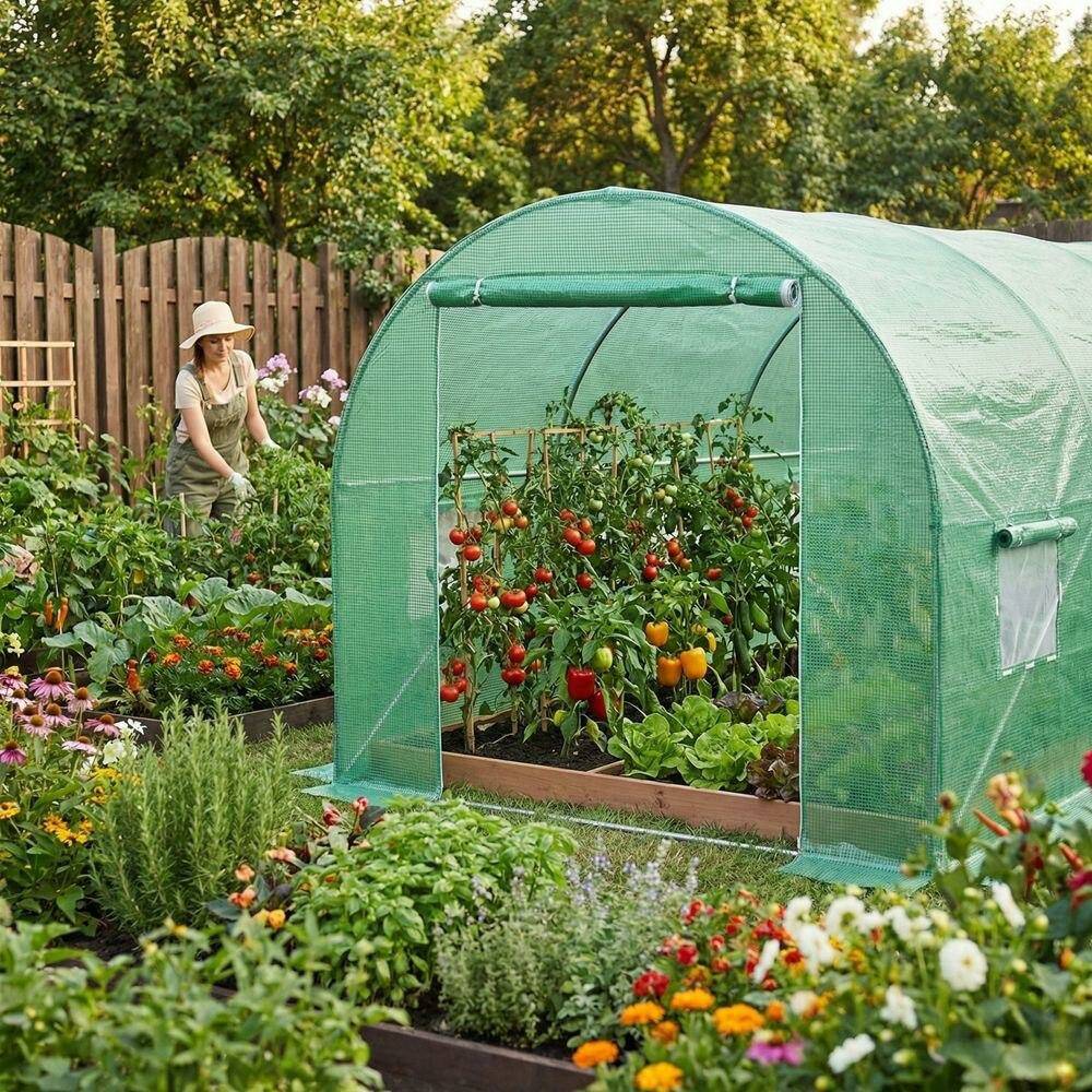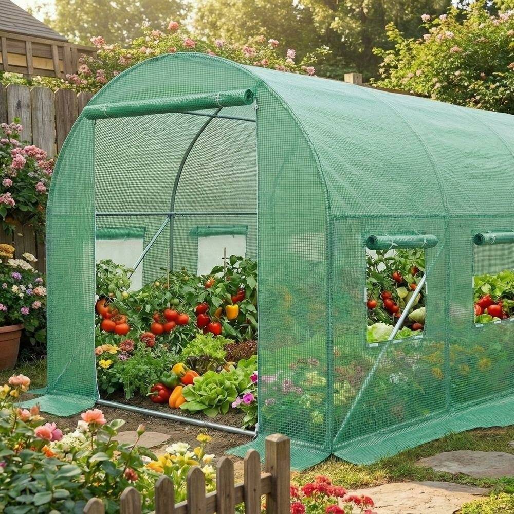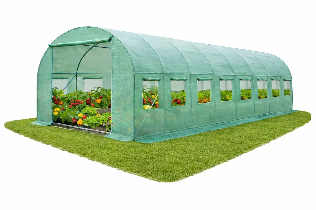 Плівкові теплиці ідеально підходять для вирощування різноманітних овочів: помідорів, огірків, перцю, квасолі, кабачків та інших культур, фактично замінюючи присадибний город. Металева конструкція утворює 8 секцій, а для додаткової стабільності передбачена верхня поперечна перекладина.