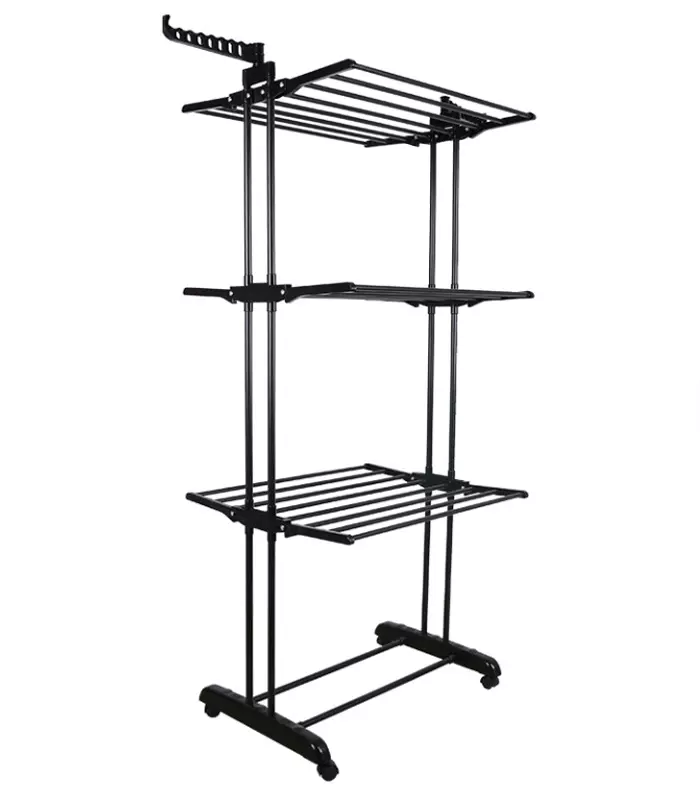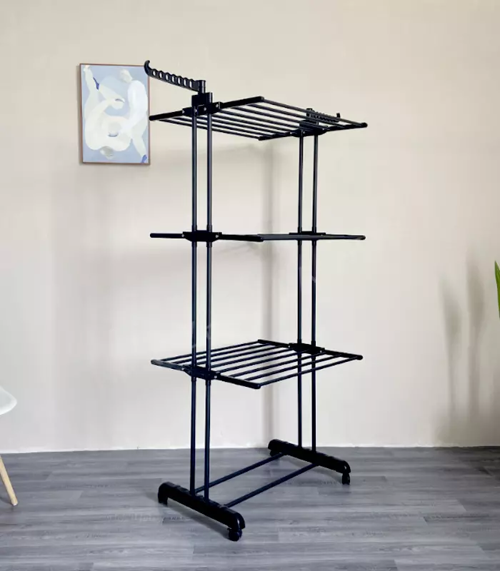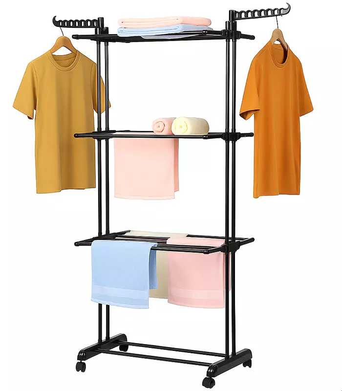 Сушарка оснащена трьома рівнями для розвішування мокрої білизни та текстилю. Це забезпечує достатньо простору для одночасного сушіння багатьох речей. Два бічні відкидні крила дозволяють розміщувати вішалки — завдяки цьому одяг залишається рівним і не мнеться. Ще однією перевагою є складна конструкція, яка дозволяє зручно зберігати сушарку навіть у невеликих квартирах. У складеному вигляді вона легко поміститься за меблями або в кутку кімнати.
