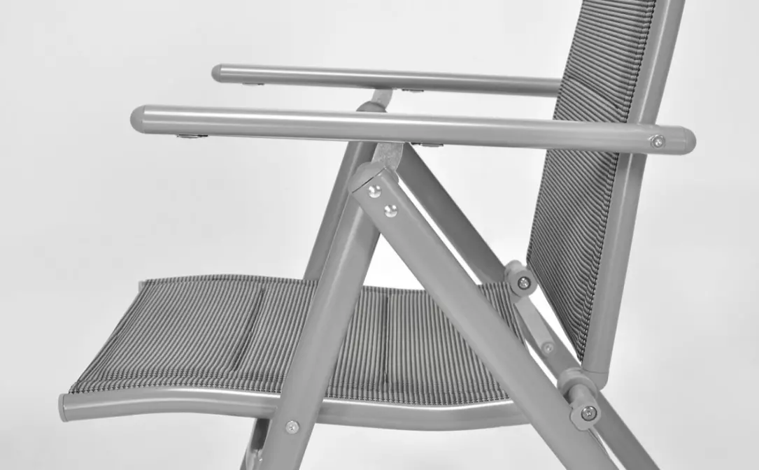 Стильний та практичний садовий стілець MODENA — ідеальне рішення для відпочинку на терасі, балконі, у саду чи на дачі. Завдяки легкому, але міцному алюмінієвому каркасу він поєднує мобільність, стійкість і довговічність. Сидіння та спинка виготовлені з якісного зносостійкого матеріалу textilene, який добре пропускає повітря, швидко висихає та не втрачає вигляд під впливом погодних умов. Стілець легко складається, займає мінімум місця при зберіганні та оснащений підлокітниками й регульованою спинкою з 8 положеннями нахилу, що дозволяє обрати максимально комфортну позицію для відпочинку.