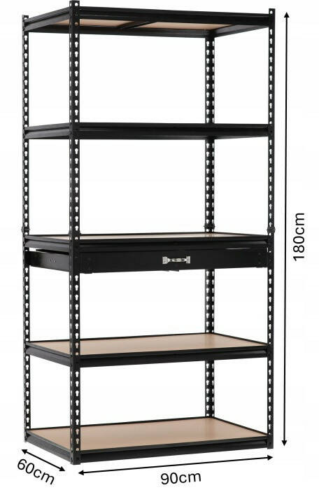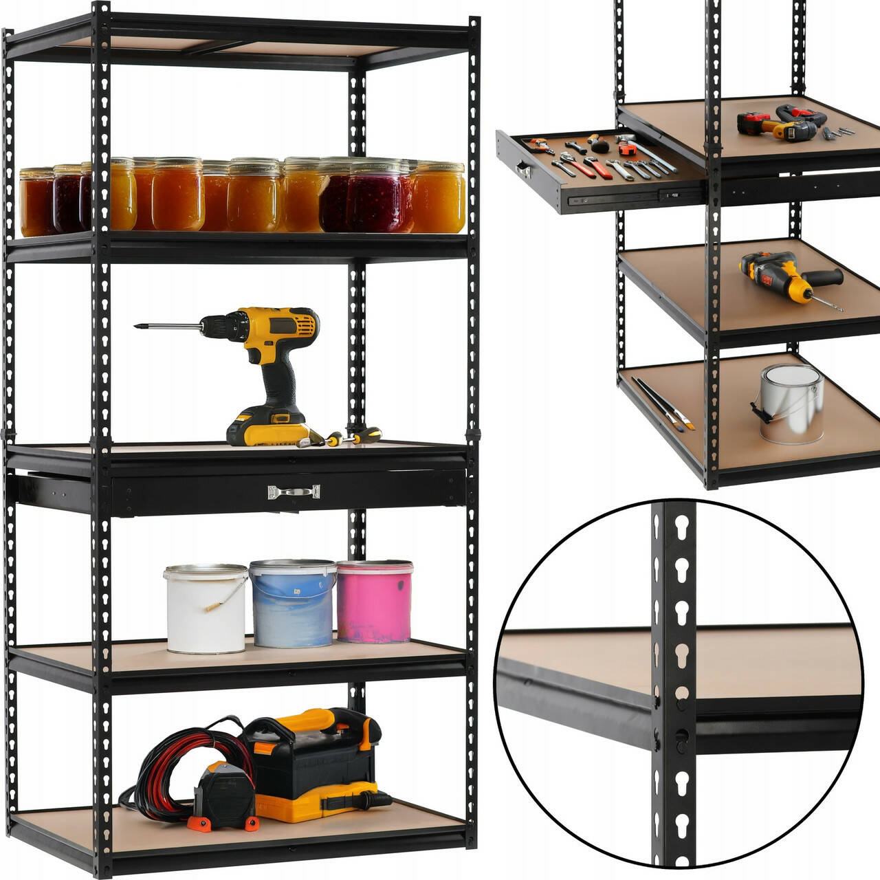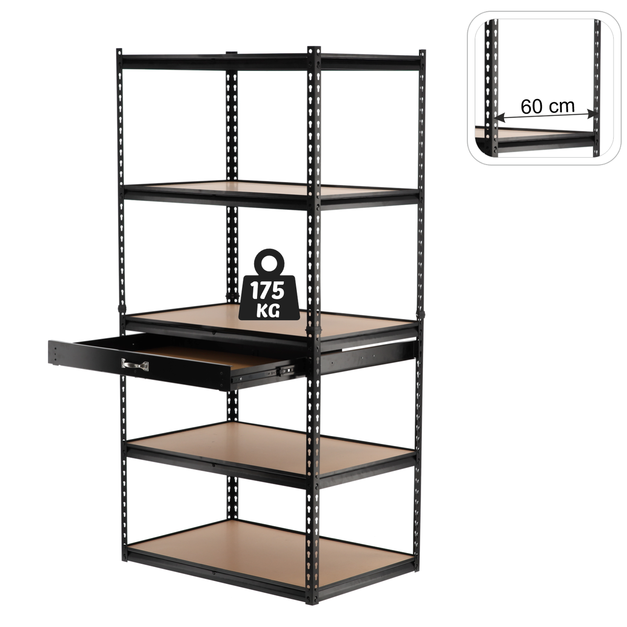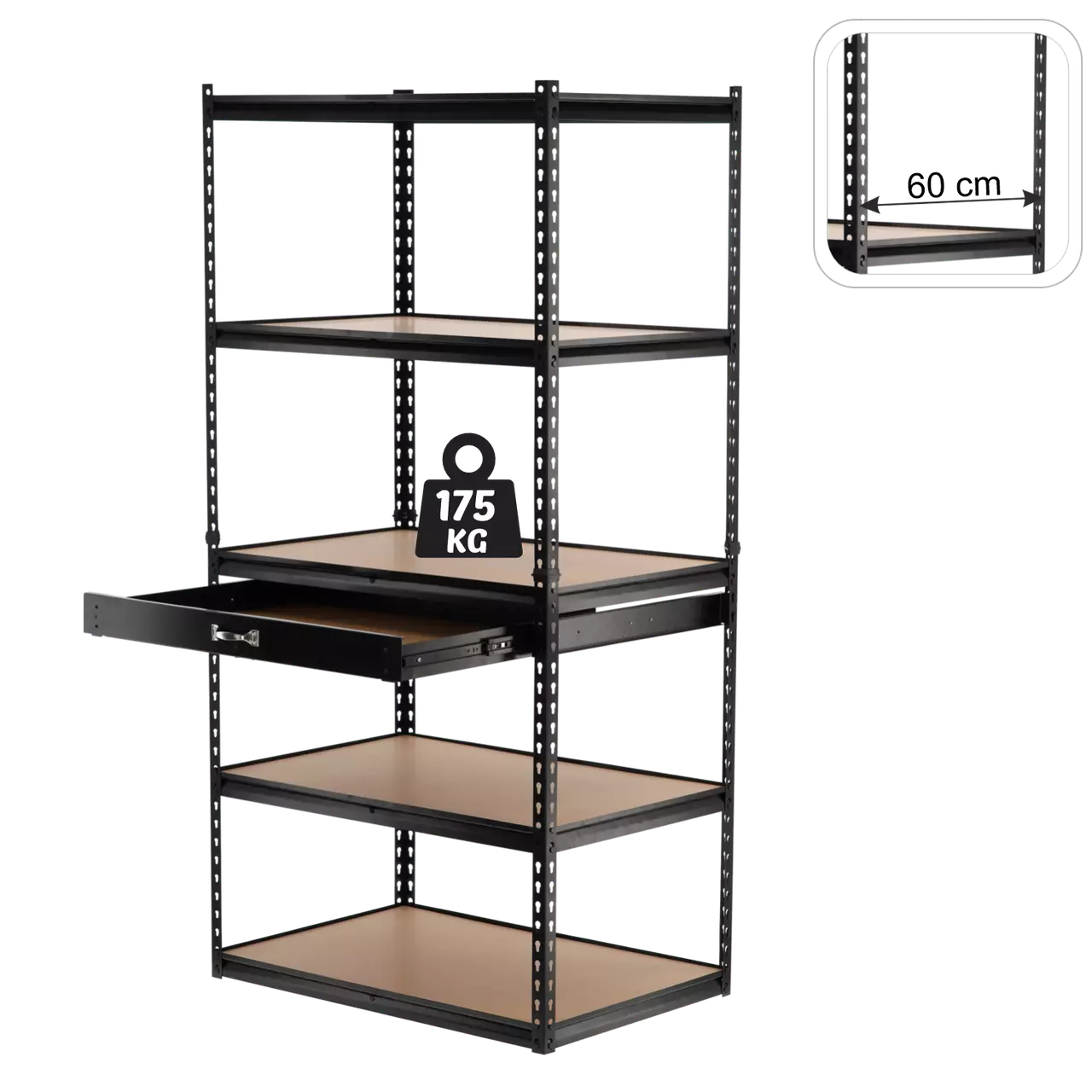 Стелаж металевий з шухлядою (180 × 90 × 60 см) 5 регульованих полиць, навантаження на полицю - 175 кг, Чорний